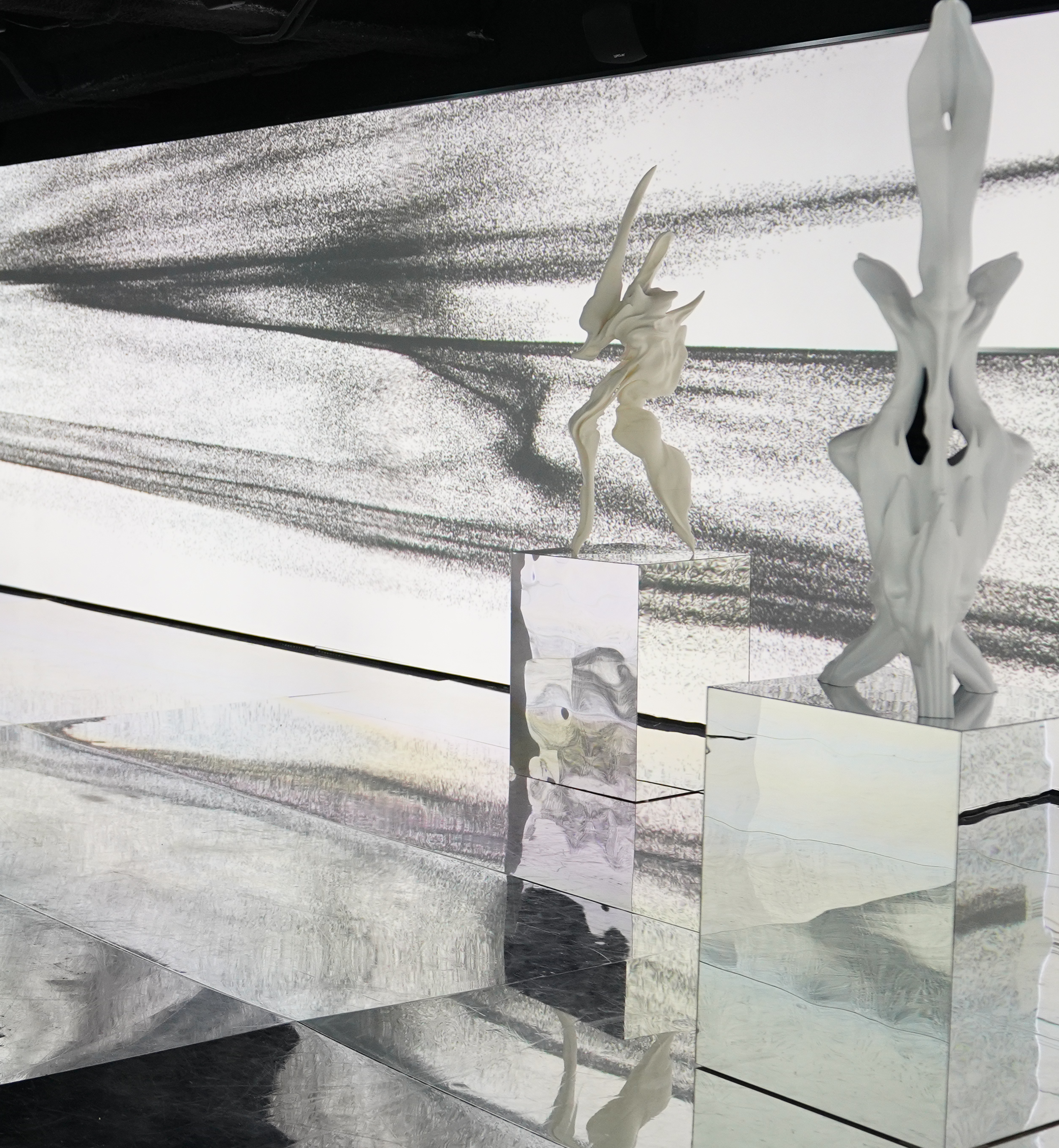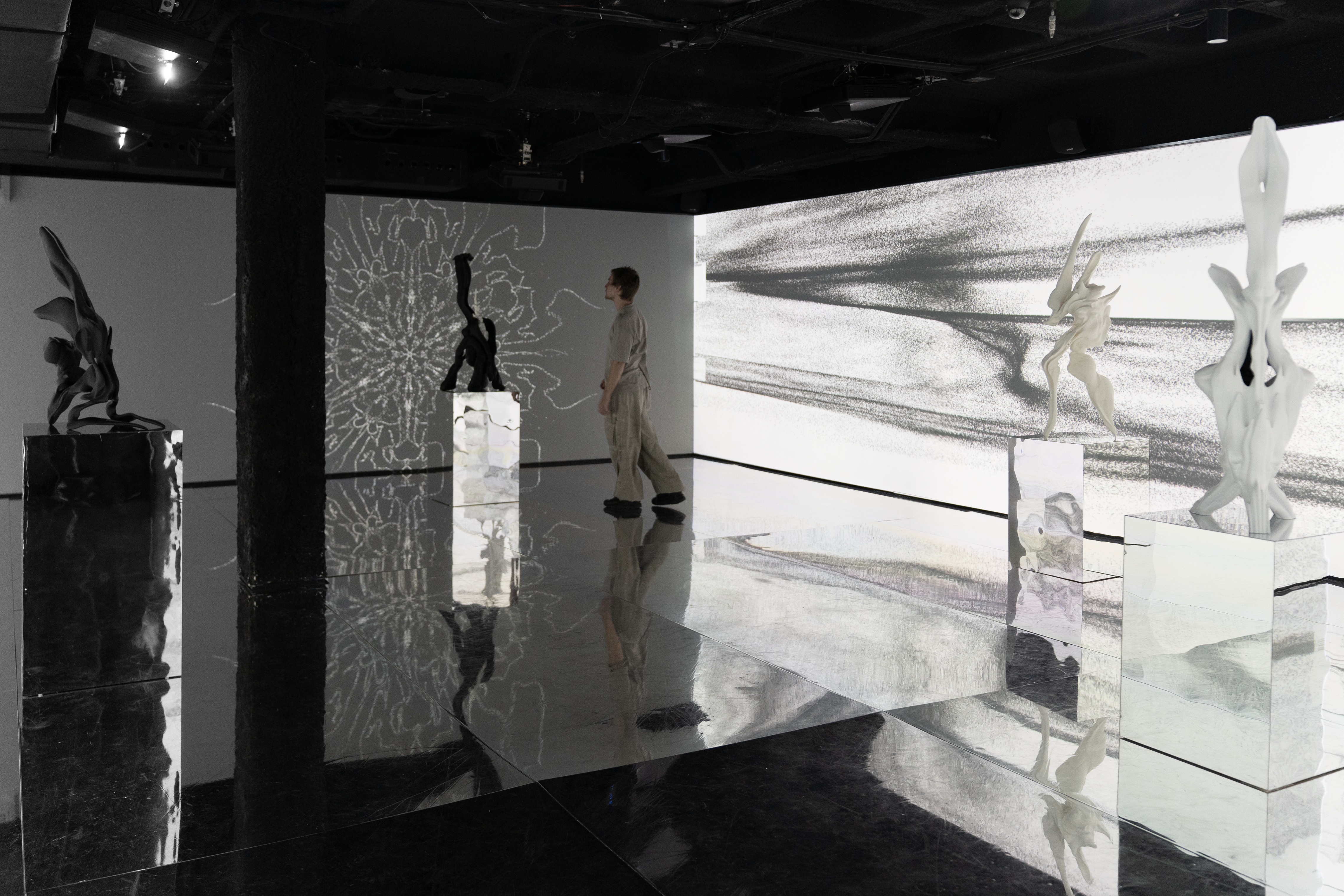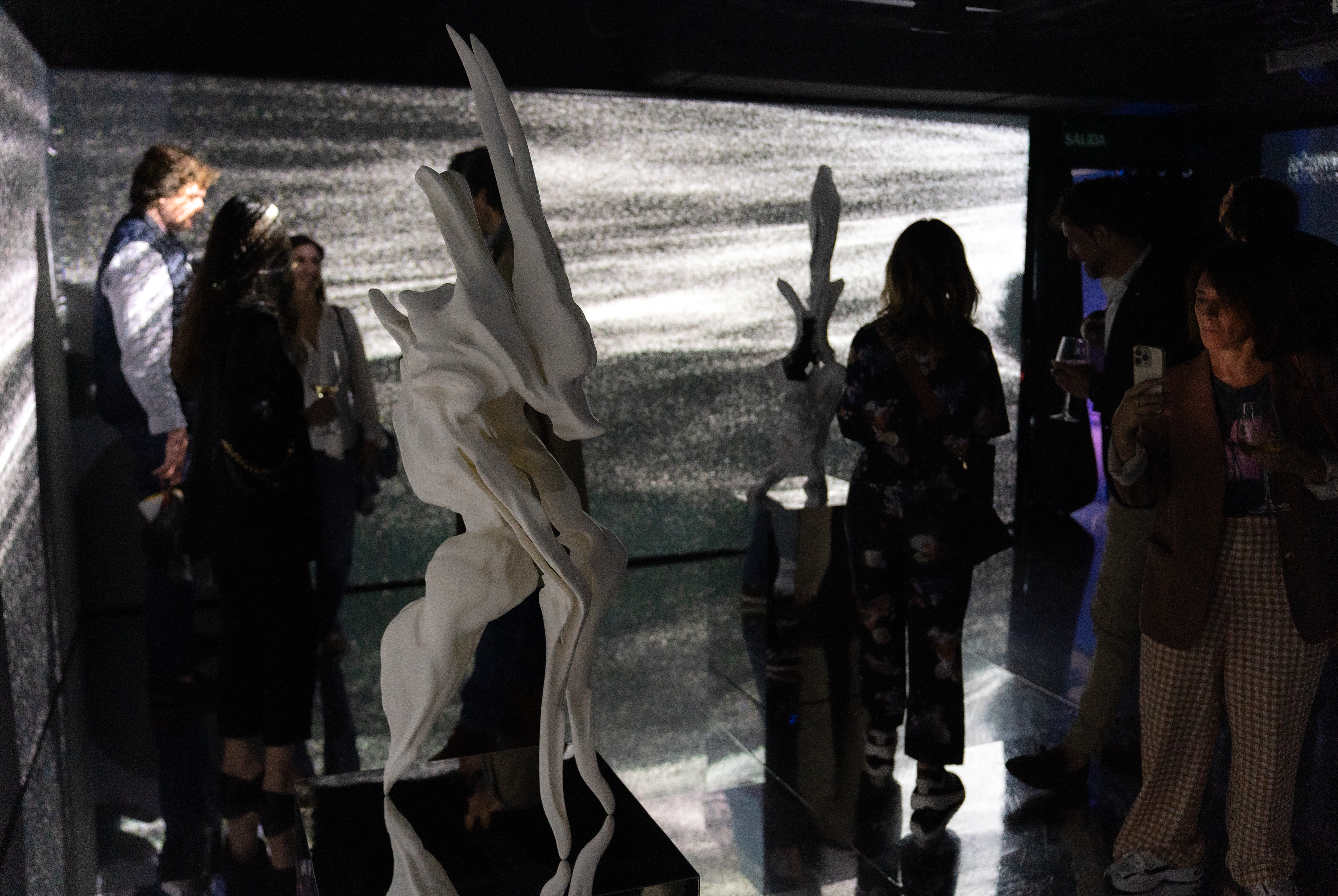 “Devenir urdimbre” fue una instalación inmersiva que entrelaza escultura, visualización digital y composición sonora para desplegar un campo perceptivo en constante vibración. Las esculturas, diseñadas e impresas por Manel Bafaluy, habitan el espacio como cuerpos orgánicos y abstractos que condensan una energía latente. Cada forma se encarna con una tensión activa, una presencia que se abre a la resonancia. Una nube de puntos, programada por Marco Ferreira, recorre la sala proyectando figuras lumínicas que evocan rosetones líquidos: patrones fugaces que articulan el espacio como si la materia misma se tejiera en luz. El paisaje sonoro de Eddgem envuelve la experiencia con capas de frecuencia y profundidad, insuflando aliento al conjunto y haciéndolo reverberar.