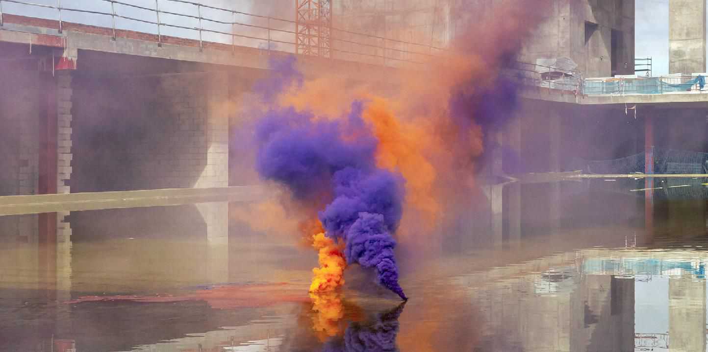 El pasado mes de noviembre Minelli viajó a Madrid para realizar la última serie de fotografías de su proyecto Silence Shapes en el espacio en construcción de Caleido. Junto a él recorrimos las entrañas de lo que será uno de los mayores proyectos inmobiliarios de la ciudad: desde los inmensos parkings, a las plazas y calles que van cobrando forma, para fotografiar junto a Minelli sus ‘bombas’ de humo de colores. El espacio cobró vida, y lo hizo a todo color. El humo subió por las paredes de hormigón, escaló andamios y se coló bajo la piel de Caleido.